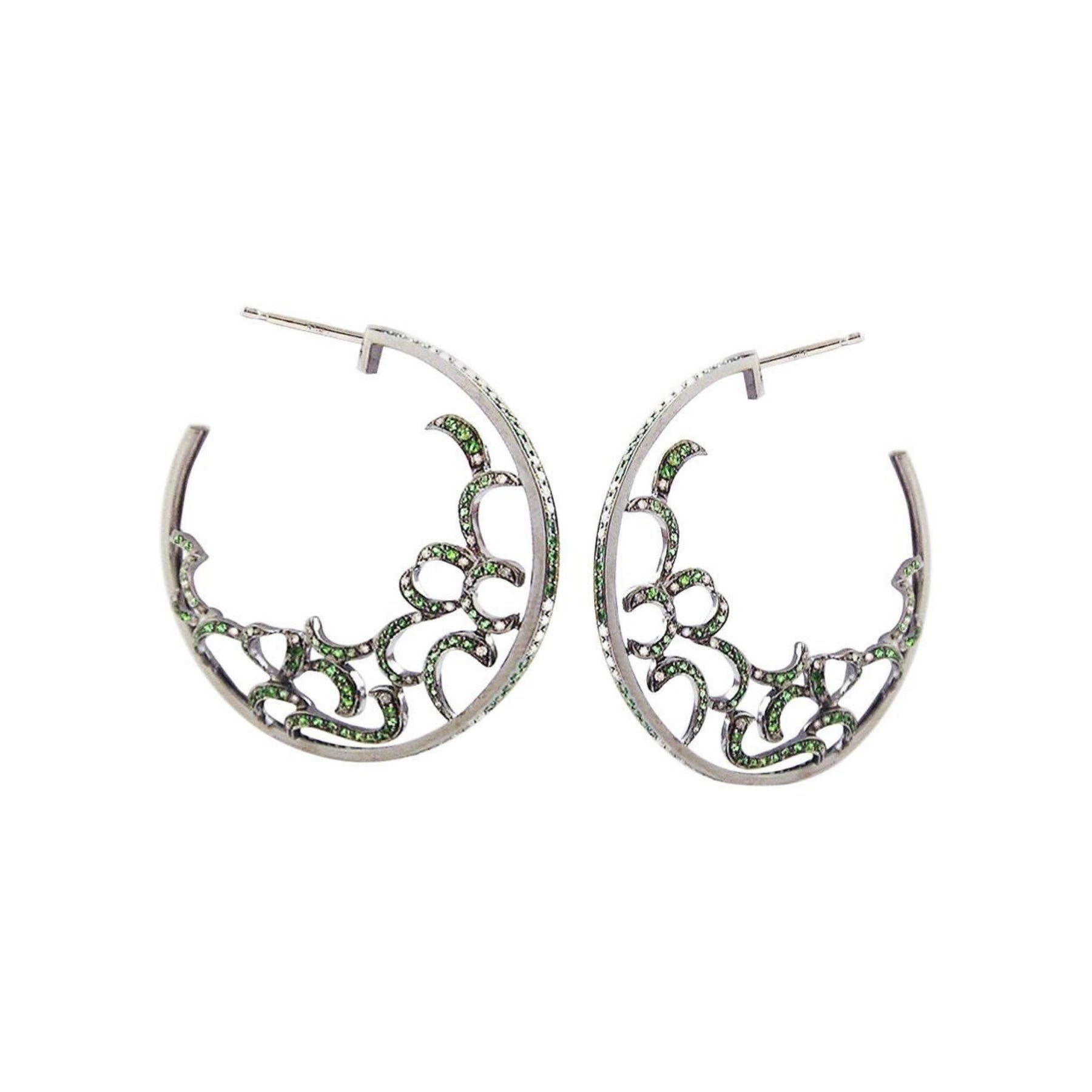 Blossom hoop earrings with 0.63ct green garnets and 0.36ct white diamonds, set in black rhodium on 18ct white gold.