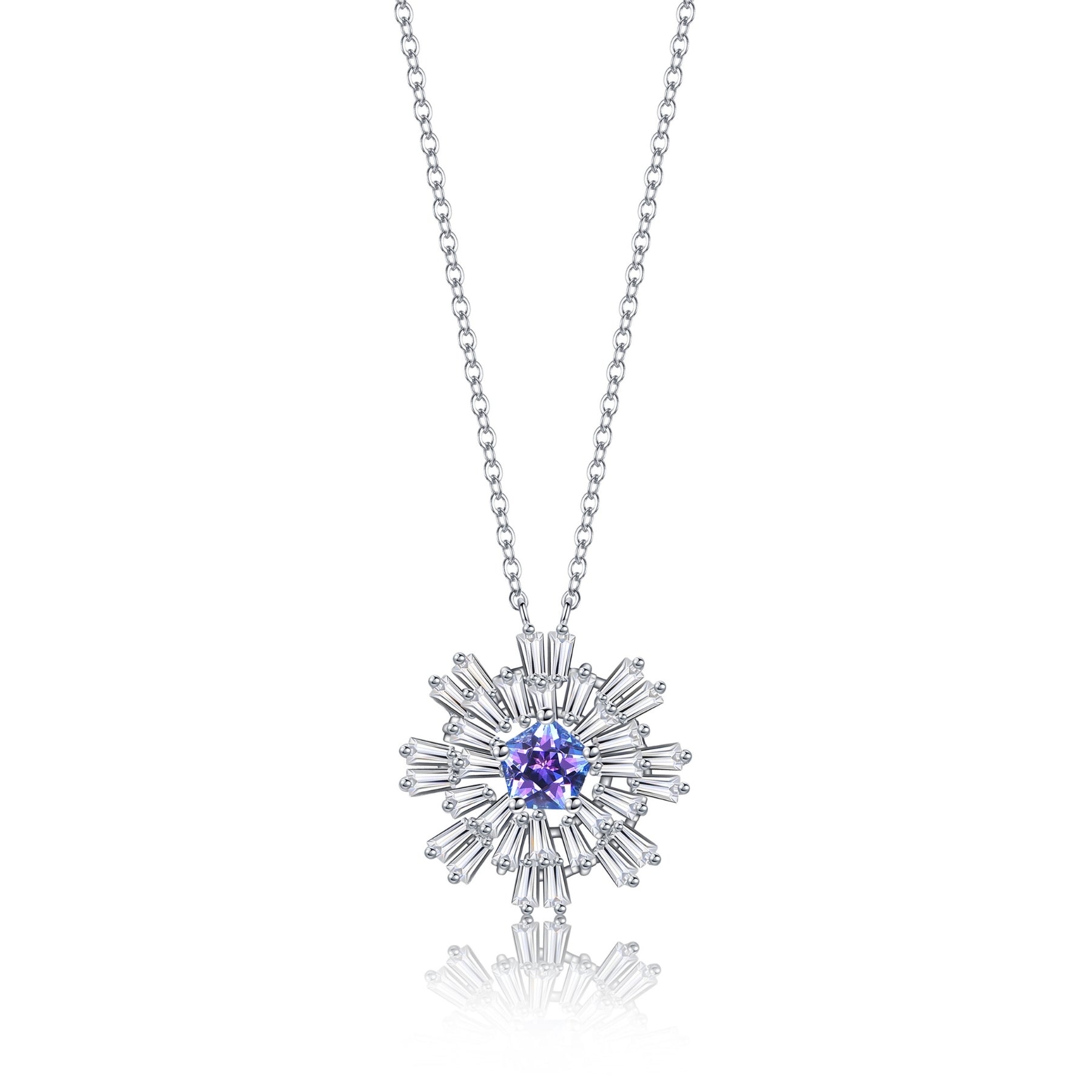 Carpe Diem ‘Flower Burst’ small pendant with Swarovski Zirconia Pentagon Star Purple-Aqua and tapered baguette CZ, set in white rhodium plate on sterling silver.