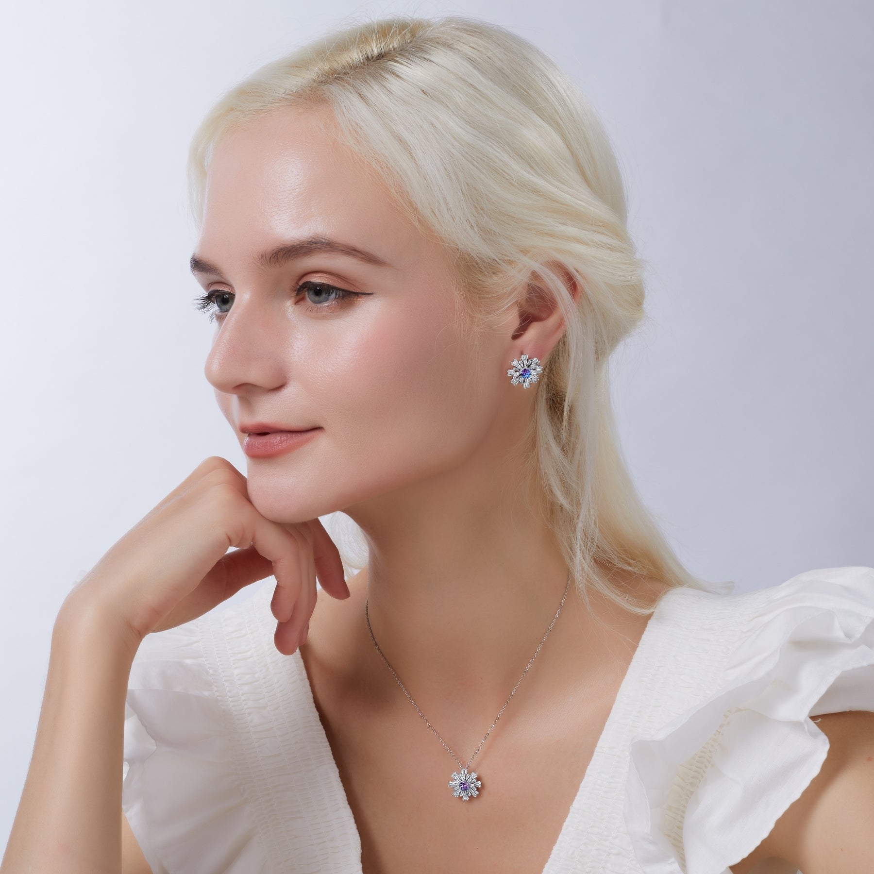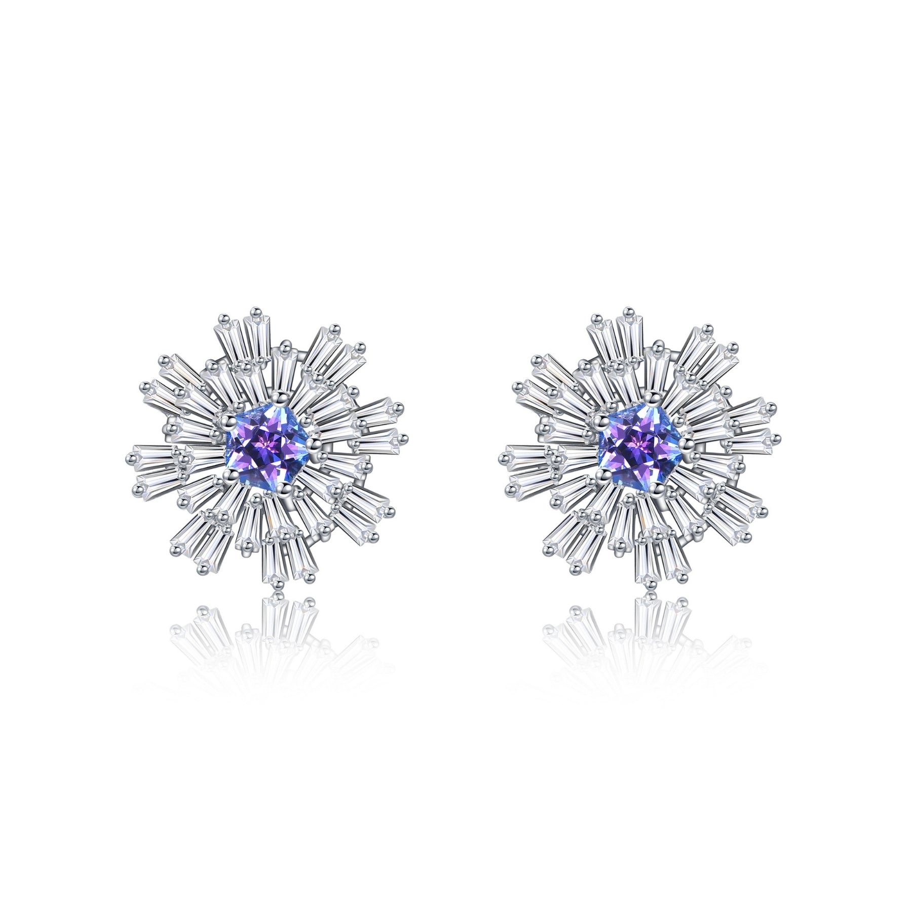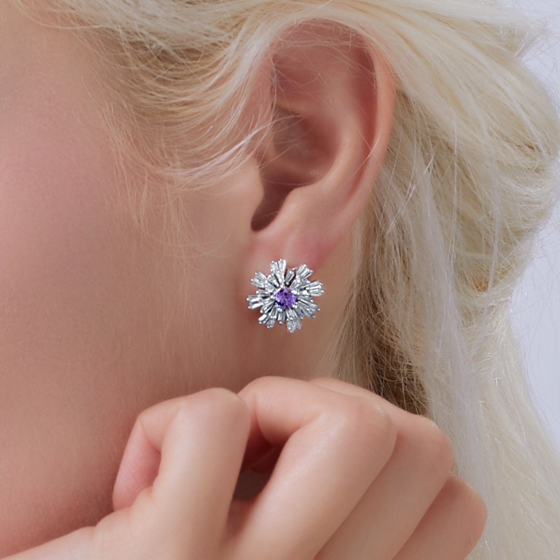 Carpe Diem ‘Flower Burst’ stud earrings with Swarovski Zirconia Pentagon Star Purple-Aqua and tapered baguette CZ, set in white rhodium plate on sterling silver.