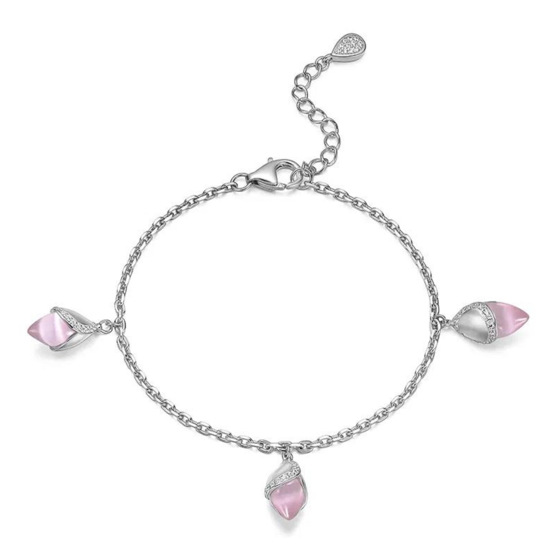 This Magnolia bracelet features three 9mm x 5.5mm grey or pink cat’s eye stones and cubic zirconia, set in white rhodium plate on sterling silver.