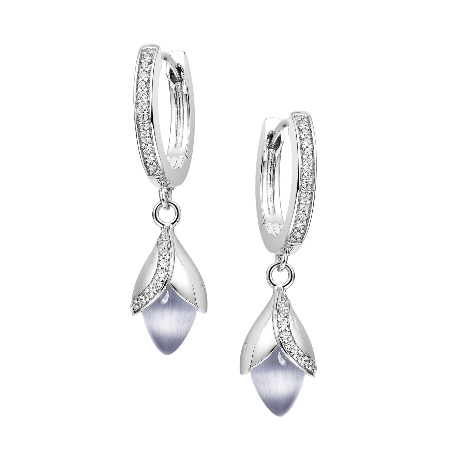 Magnolia hoop earrings with grey or pink cat’s eye stones and cubic zirconia, set in white rhodium plate on sterling silver.