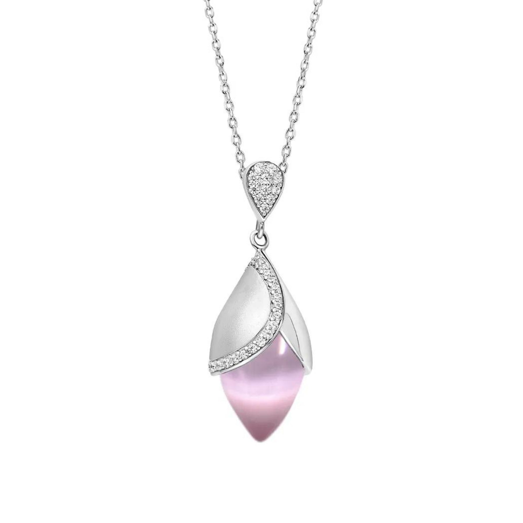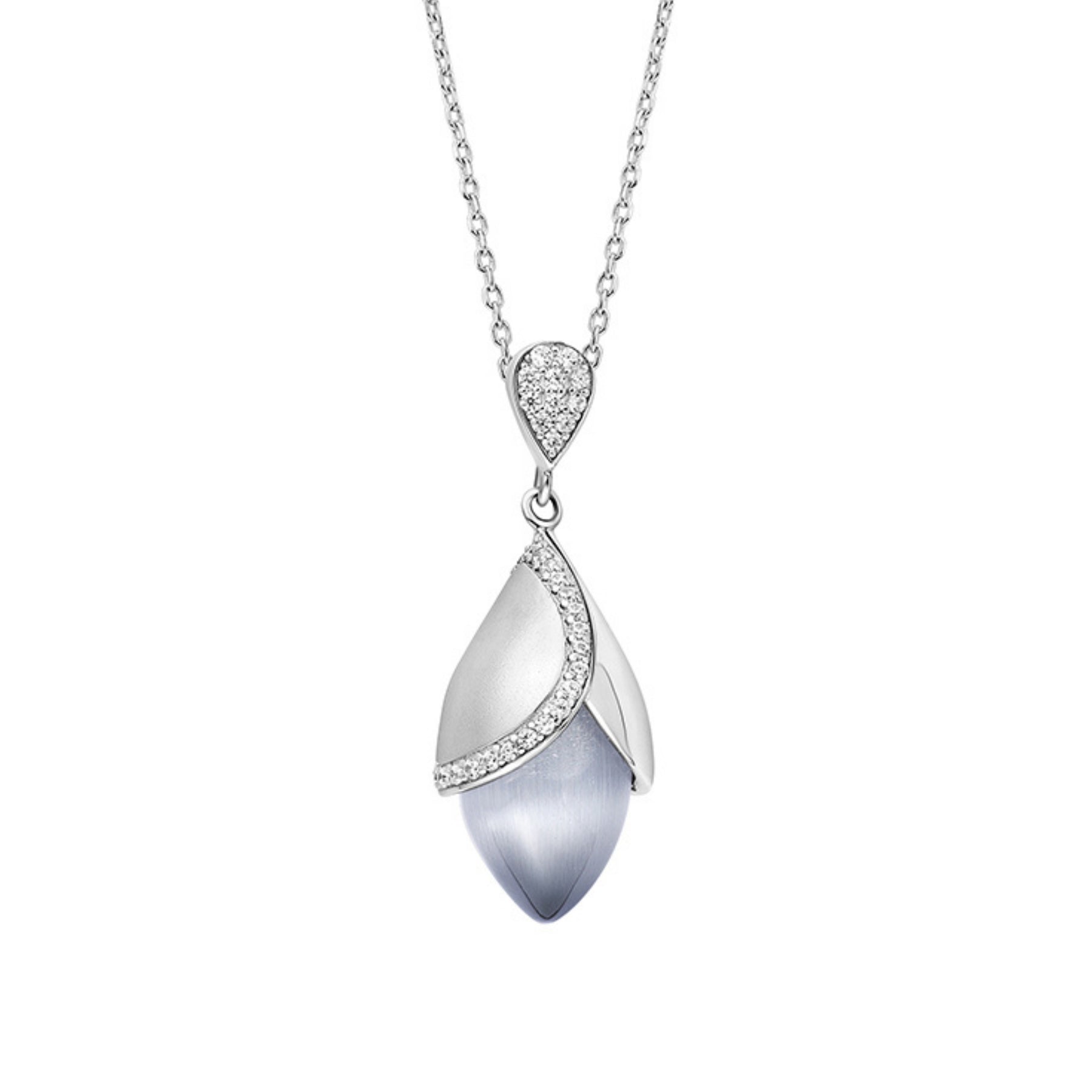 Magnolia large pendant with a 14mm x 8.5mm grey or pink cat’s eye stone and cubic zirconia, set in white rhodium plate on sterling silver.