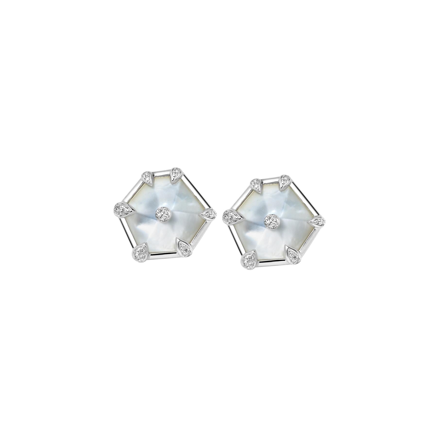 White: Nova hexagon stud earrings 0.096ct white diamonds and 3ct mother of pearl, set in 18ct white gold with a high polish.