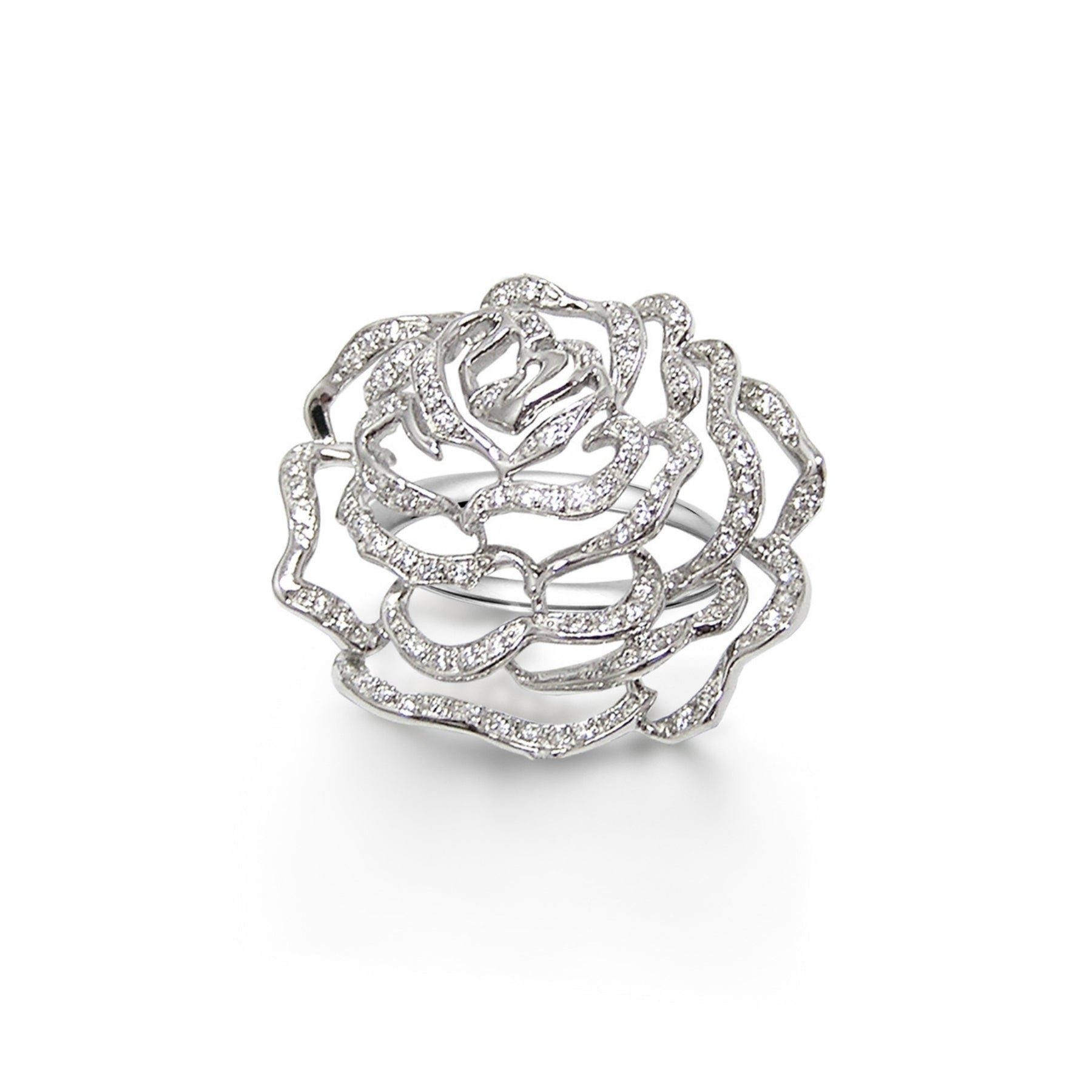 Rose large ring with cubic zirconia, set in white rhodium plated on sterling silver.