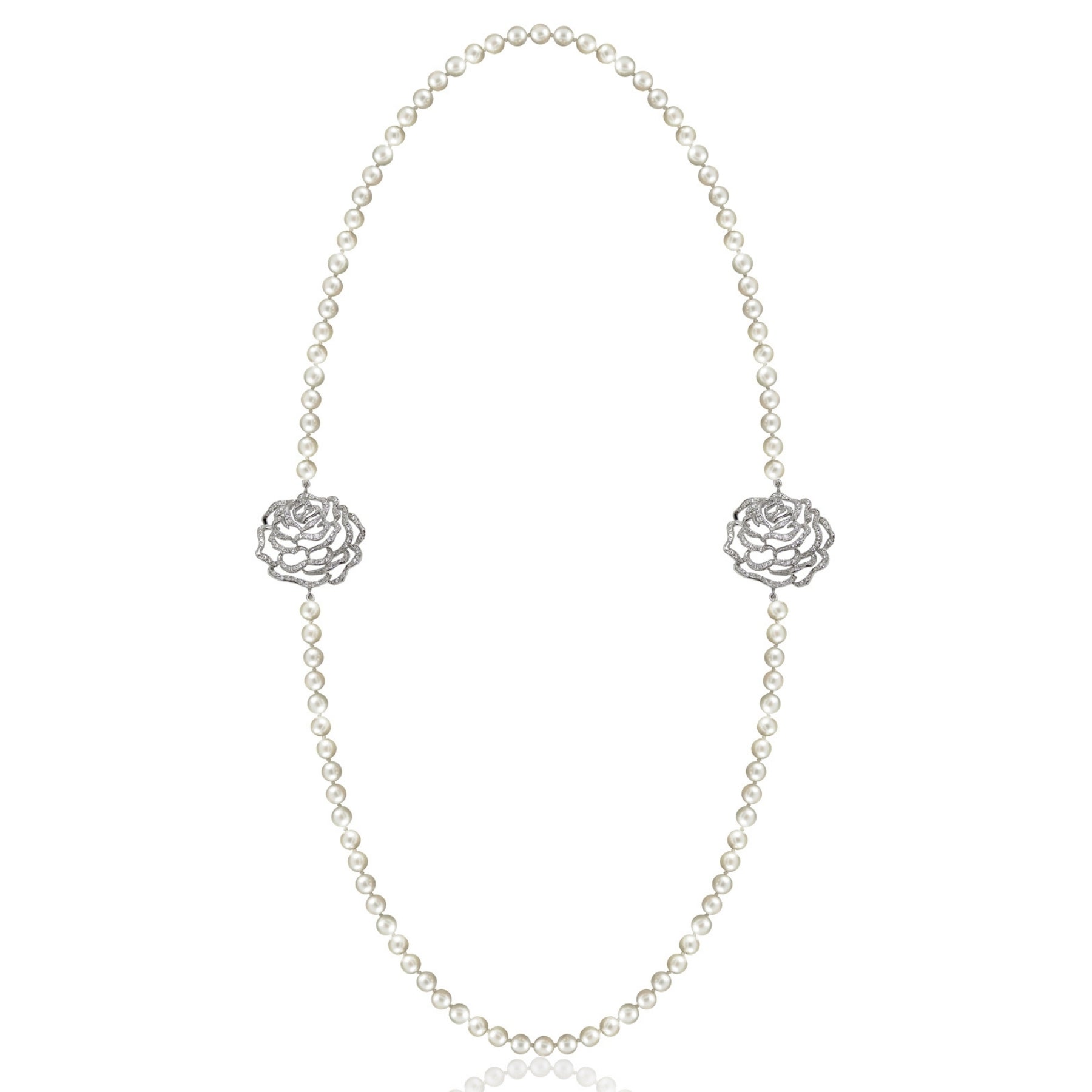 The natural beauty of the English rose is captured in the Rose Collection long pearl necklace. The delicate contours of the petals are set with 8 hearts and 8 arrows cubic zirconia, which gives the flower a beautiful glisten. The lustrous freshwater pearls radiate sophistication.