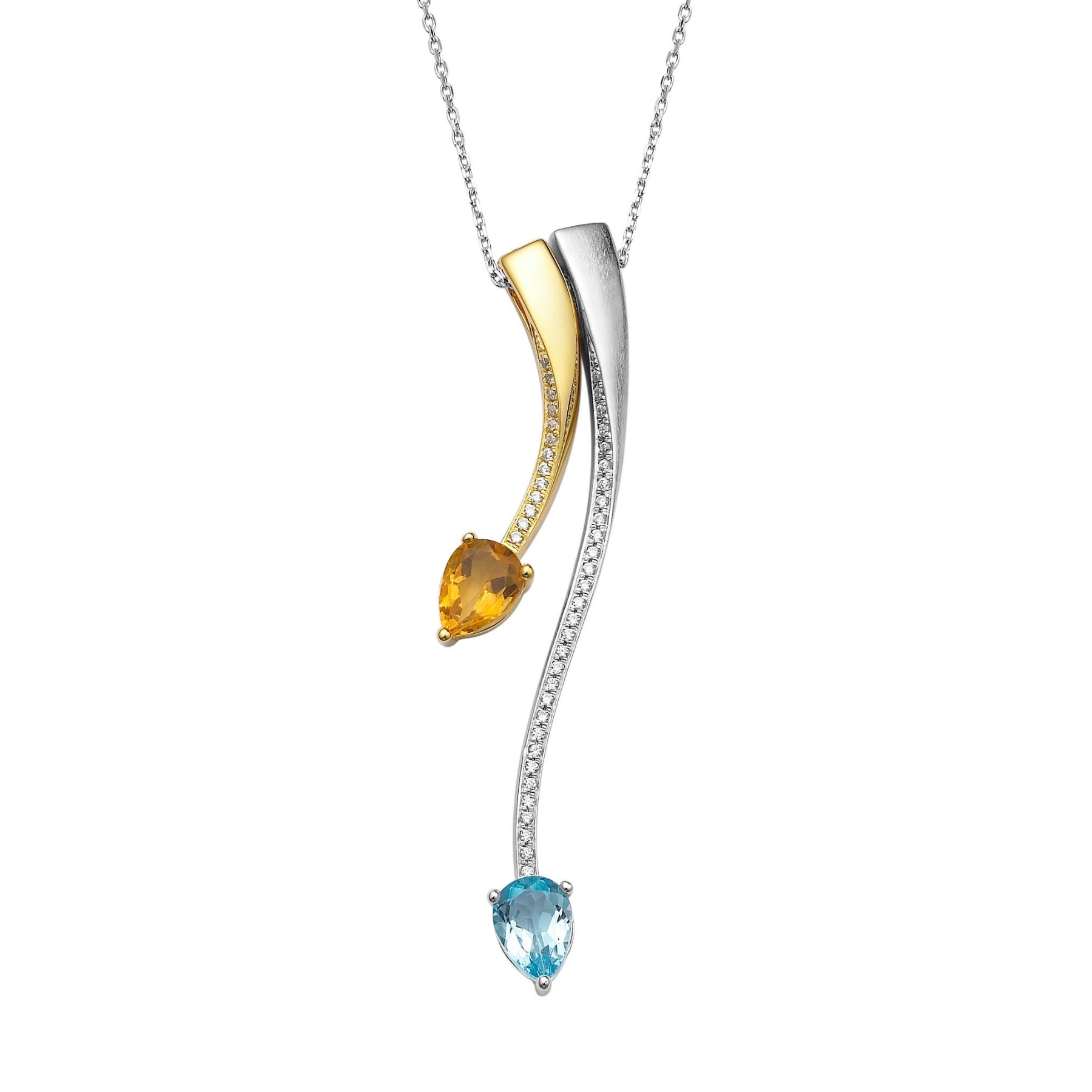 Shooting Star two tone pendant comes with luminous pear-shaped stones and cubic zirconia.