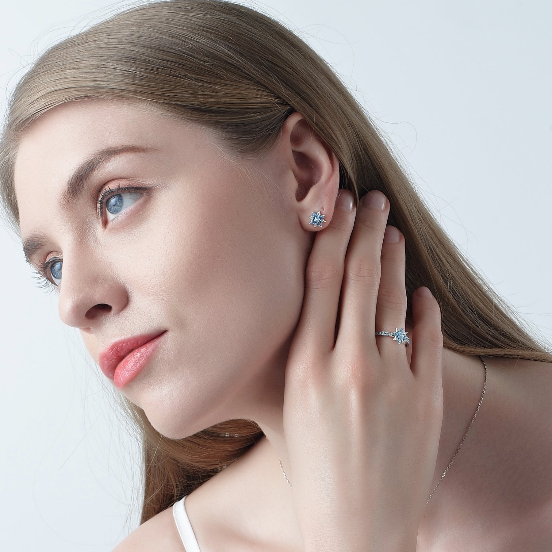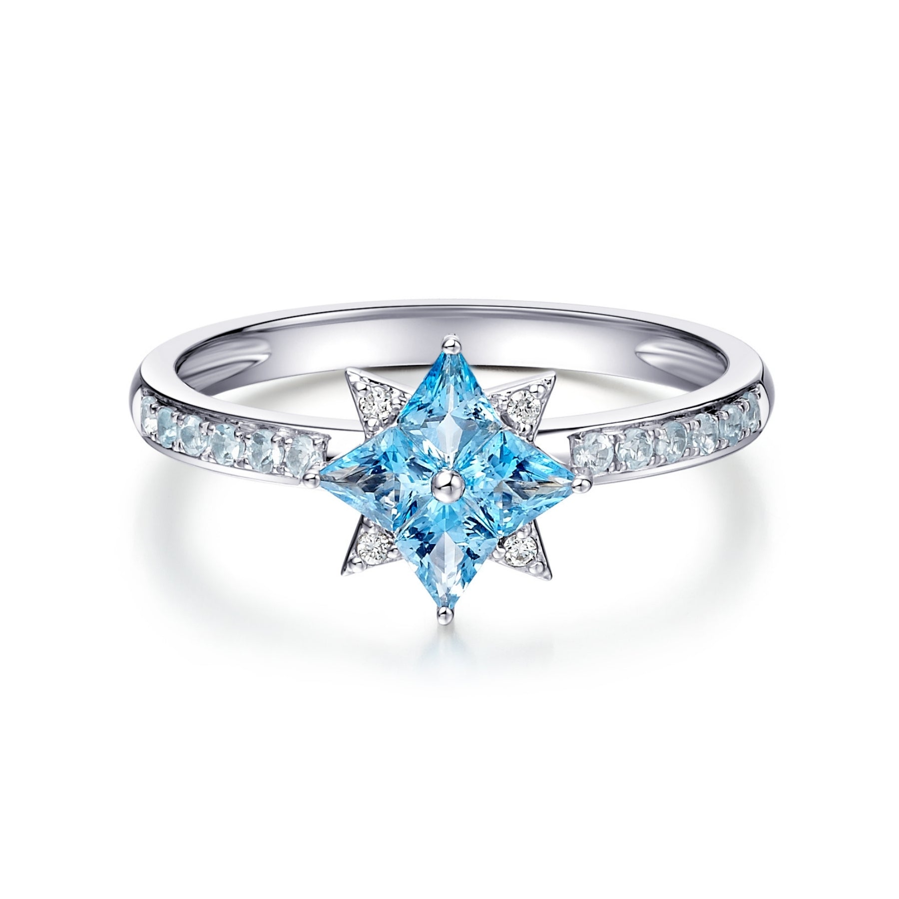 The shimmering Star of Love Mini Star ring is set with four custom ‘kite cut’ blue topaz and cubic zirconia set in rhodium plate on sterling silver.