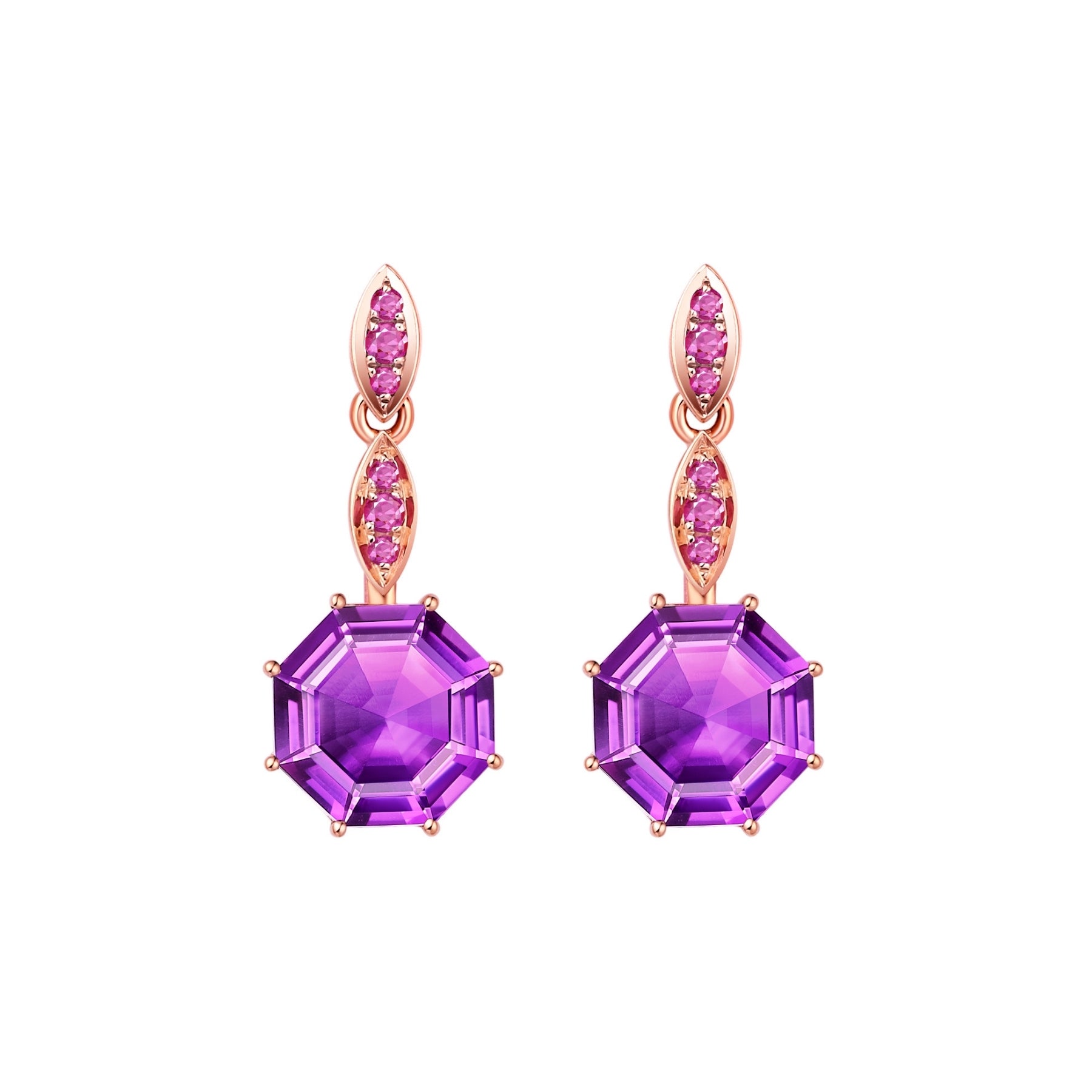 Victoriana small octagon cut short drop earrings with 3.20ct purple amethyst and 0.13ct pink sapphires, set in 18ct rose gold