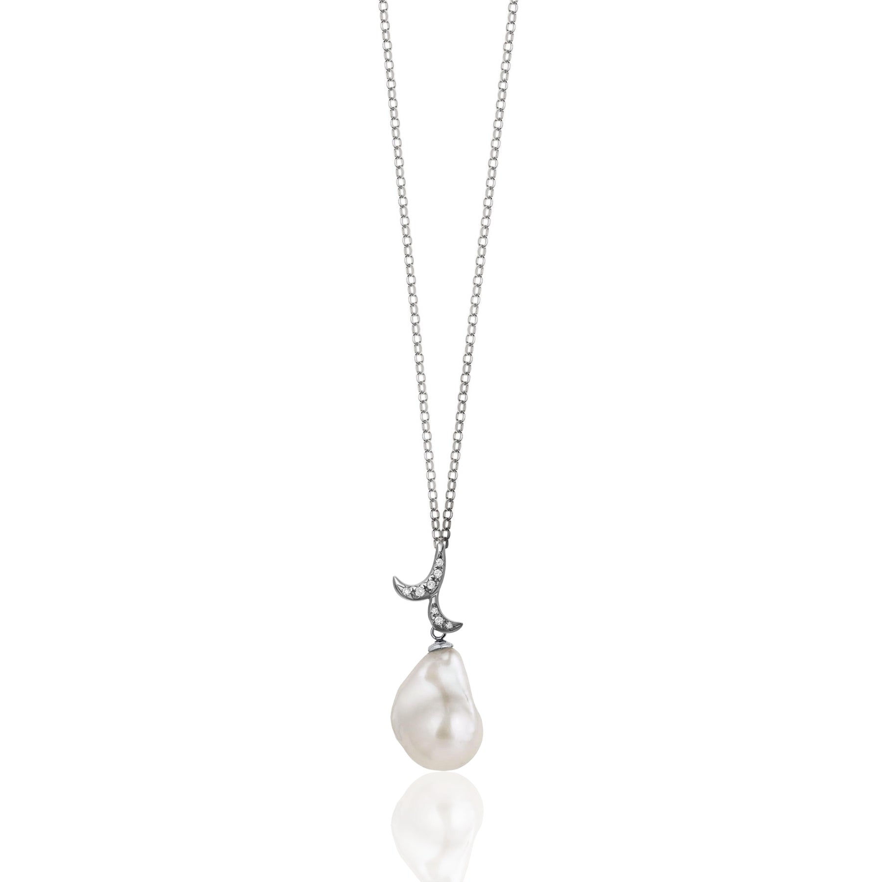 Whispering baroque pearl pendant with 0.03ct white diamonds and a 12mm x 14mm baroque pearl, set in black rhodium plate on 18ct white gold.