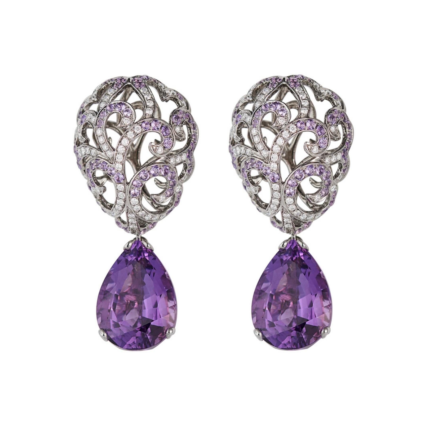 Whispering drop earrings in 18ct white gold. Featuring sculptural filigree eggs set with diamonds and purple amethyst. The suspended pear-cut purple amethyst adds an extra sparkle of glamour.