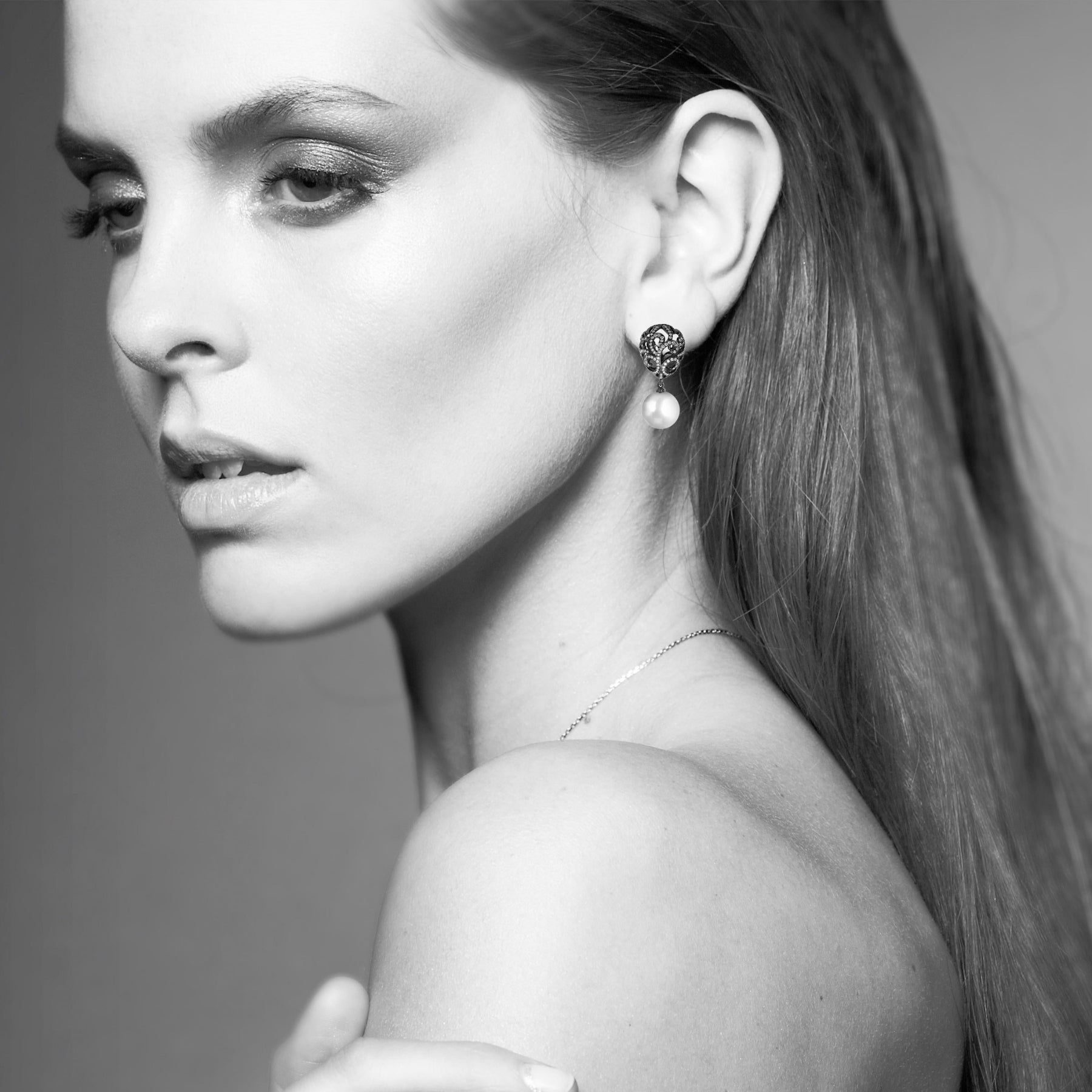 Whispering round pearl small filigree egg earrings with 0.06ct white diamonds set in black rhodium plate on 18ct white gold.